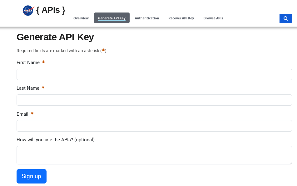 NASA has a range of powerful APIs to meet the need of space-related applications. In fact, NASA provides an Open API page, where you can easily generate an API key. To get started, click on the “Generate API Key” tab, which will take you to a page resembling the image below. Once you’ve completed this step, you will get an email (from noreply@api.data.gov) containing your newly generated API key. This key will be essential for using the API in scripts, such as generating LANDSAT 8 images.