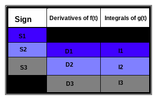 I’ve included a column of alternating signs, which is a fundamental feature of the tabular integration method. The next step is to understand how this table captures the structure of the results of our integral. Now consider the table below: