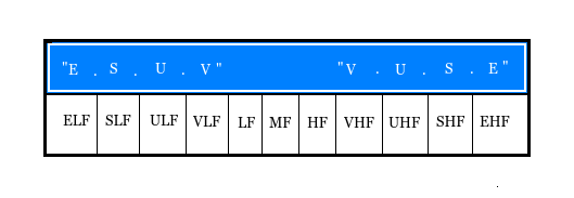 Observe that at the center of the table lie LF, MF, and HF, denoting Low, Medium, and High Frequencies respectively. As we move outward from the middle both LF and HF are expanded using the VUSE prefixes, respectively reflecting decreasing and increasing orders of magnitude. The table below further characterizes how these orders of magnitudes are split in the spectrum: