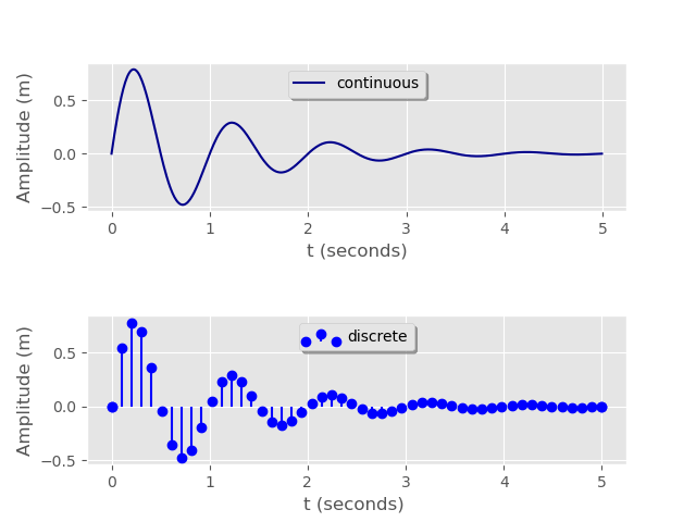 . From the discrete graph above, we observe that each plot extends up to 5 seconds, and our code indicates that 50 samples were taken in this timeframe. Therefore we can compute: