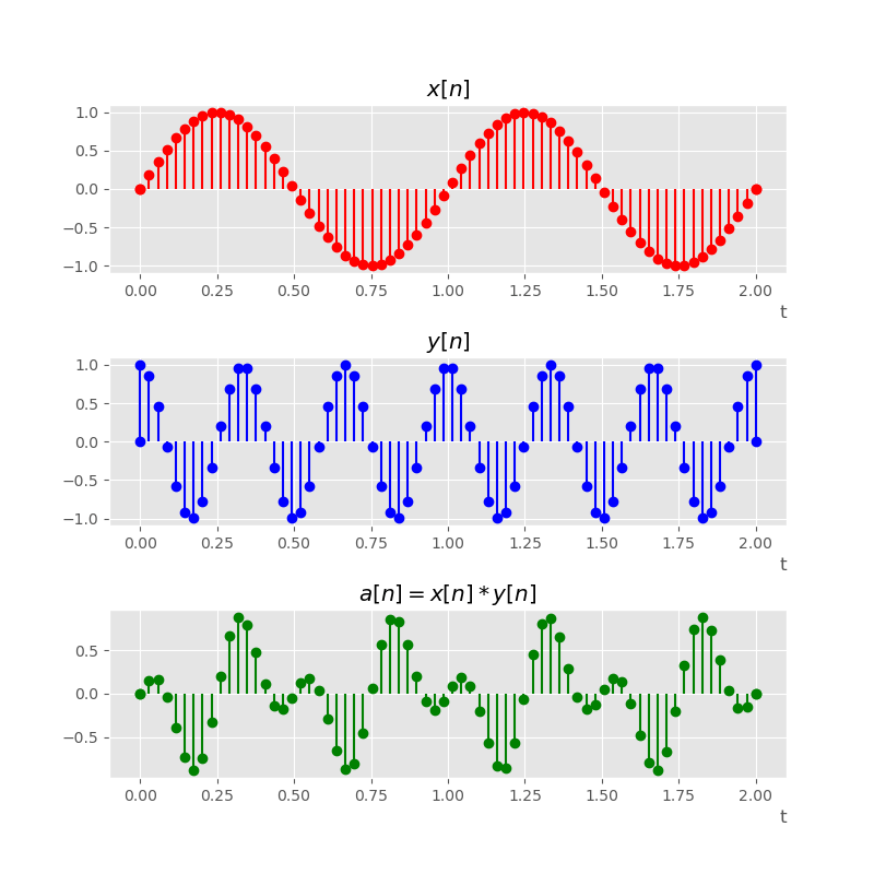 Multiplying waveforms is pretty straightforward. Similar to addition and subtraction, it requires two input sequences, but it returns the product of those sequences.