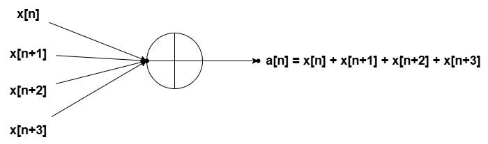 Another common operation useful in DSP is the summation operator. This operator iteratively takes a specified number of consecutive values as inputs and produces their sum as the output. The number of values taken as input is called the window of the summation. For example, the window in the diagram below equals 3.